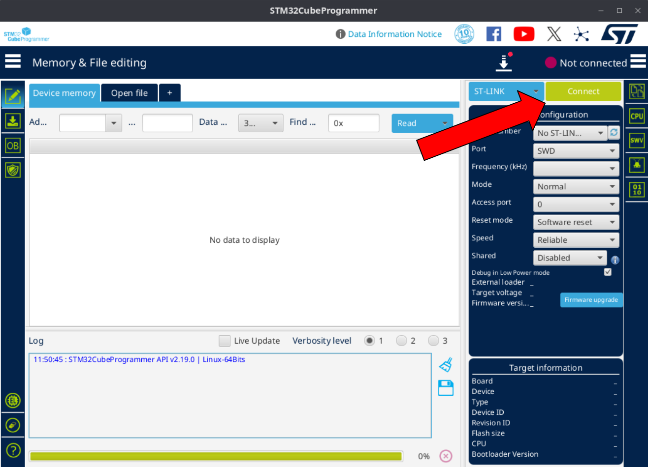 Plug in the USB connector from the ST-Link to the computer. Select "Connect" in the STM32CubeProgrammer. This should detect the ST-Link and connect automatically.