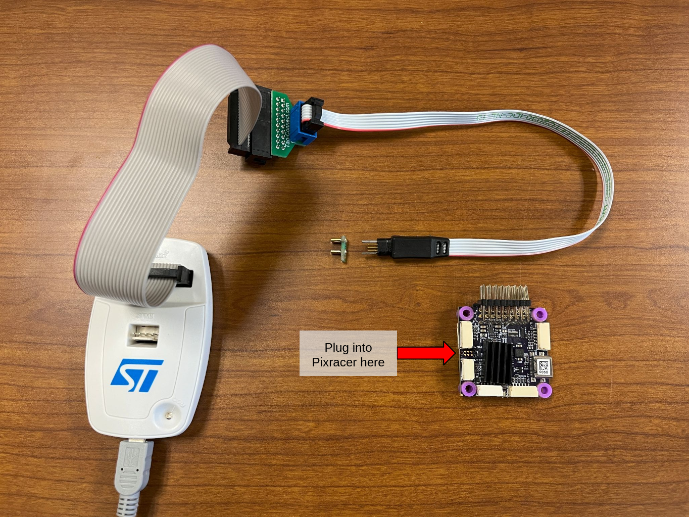 The Pixracer Pro does not use the same 6-pin connector to connect to the ST-Link. Instead, it uses a TC2030 connector with retaining clips.