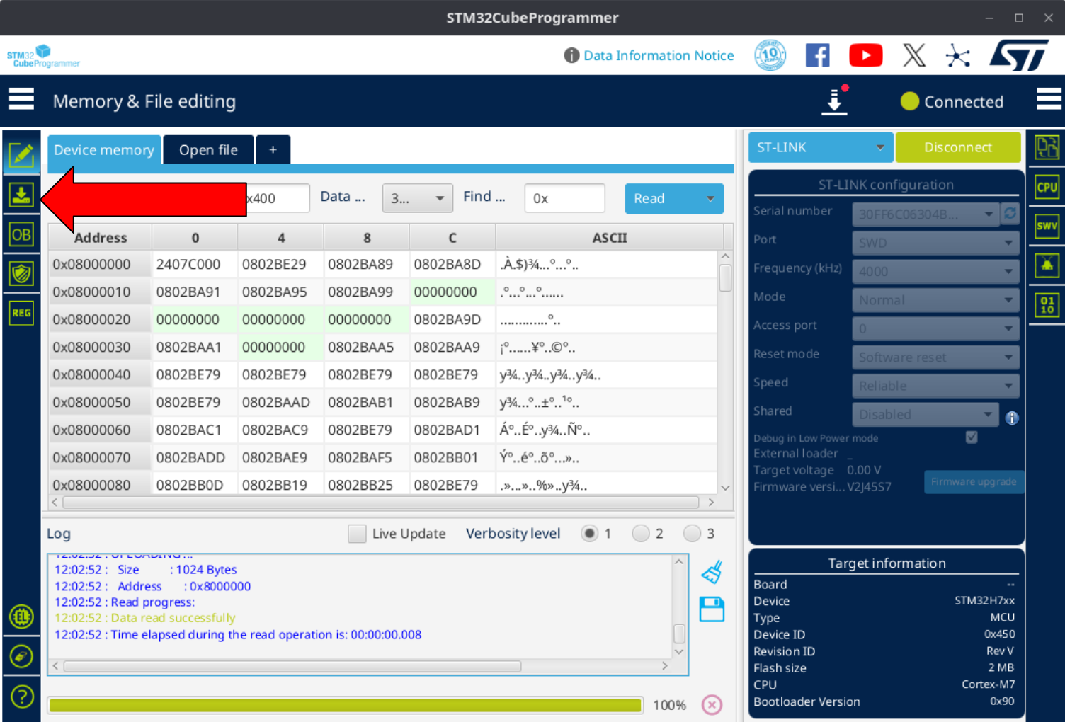 Plug in the USB connector from the ST-Link to the computer. Select "Connect" in the STM32CubeProgrammer. This should detect the ST-Link and connect automatically.