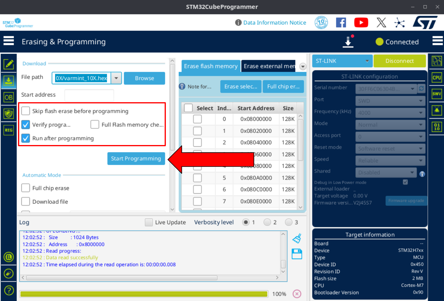 You will need an ST-Link STM programmer to flash the firmware. We use ST-Link V2, and you can find it on Mouser.