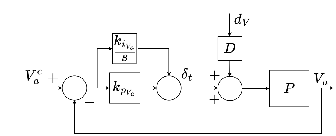 The Airspeed loop is a PI loop. It reacts to the straight forward error in commanded airspeed V_a^c given by the waypoint mission. It generates the required throttle, \delta_t, to acheive the commanded airspeed. This is suffecient because of the natural damping of the drag on the aircraft. In practice, the loop performs well, but is prone to small fluctuations (on the order of \pm 1 \frac{m}{s}) due to the differential pressure sensor fluctuating because of wind and other disturbances.
