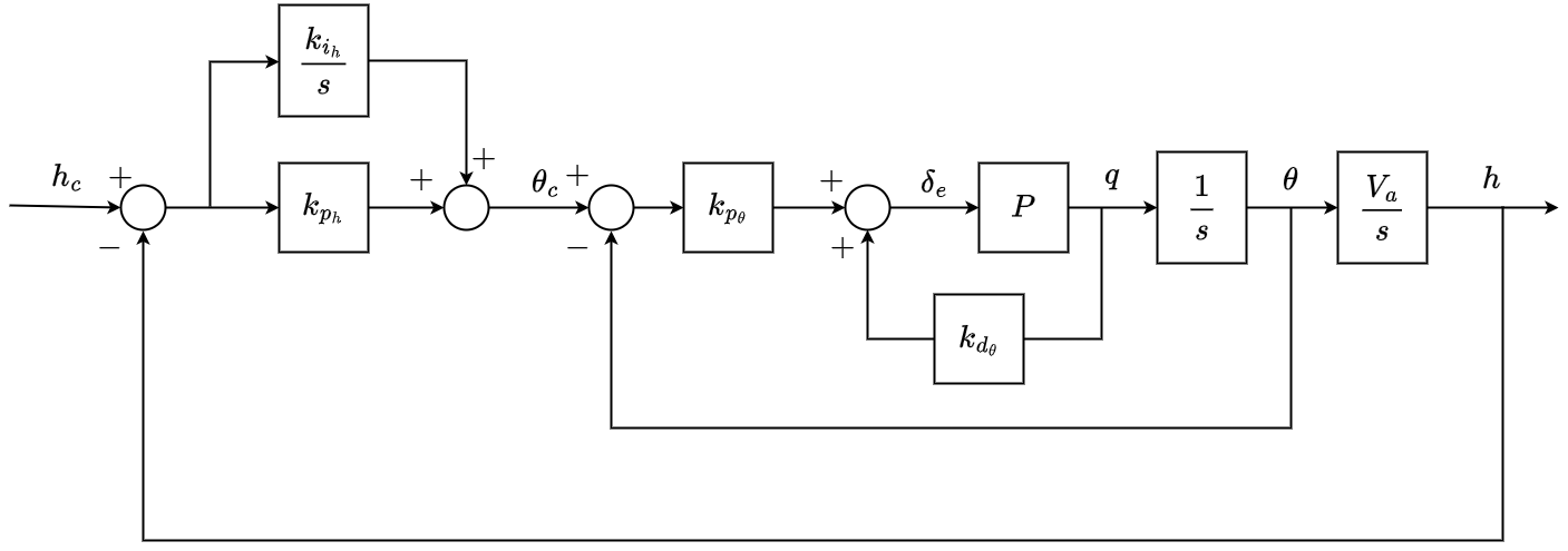 The inner loop controls the pitch, \boldsymbol{\theta}. It does so by calculating the necessary \boldsymbol{\delta_e} to acheive the commanded pitch. This is a PD loop, this means that there is often a small DC offset to the commanded pitch. This does not affect the performance of the overall altitude loop. Like the inner loop of the course control, the derivative gain acts on the measured pitch rate rather than the error derivative.