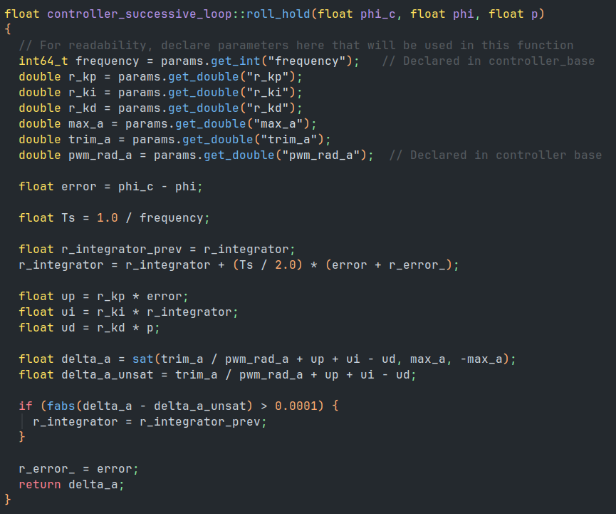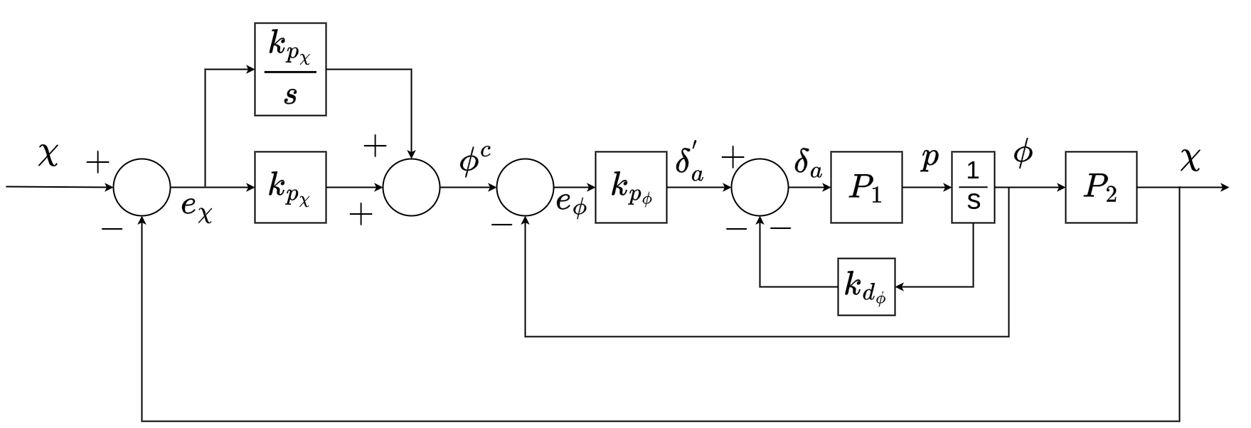 The inner loop calculates the required percent deflection in the ailerons, \boldsymbol{\delta_a}, to acheive the commanded roll angle generated by the outer loop. This loop is a PD loop, meaning that it uses only a proportional and derivative control.
