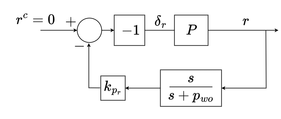 The yaw damper allows for effective damping of undesirable yaw modes induced by rolling. This is done by using the rudder to control the yaw rate, r, to zero. Not all yaw rates should be controlled to zero since this would disallow turning. A washout filter is used to only damp high frequency yaw rates. In effect, this control only 'turns on' if the frequency of the yaw rate is high enough. For mor information see the Yaw Damper page.