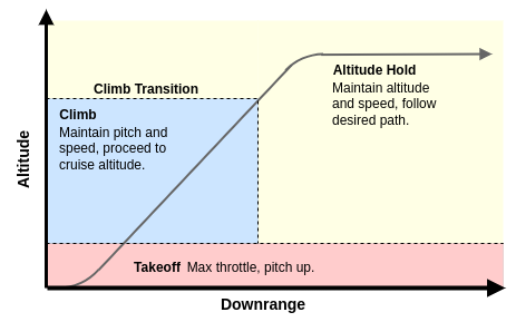 In altitude hold all control loops are closed normally. The aircraft will fly the waypoint mission as normal. If the aircraft dips beneath the takeoff cutoff, the state transitions to takeoff again.