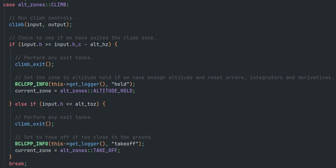 The climb state commands altitude and airspeed as normal, but still controls roll to zero. This means that the aircraft will proceed directly ahead until it is withing a cutoff (see Params section) of commanded altitude. Deactivating course control allows for the aircraft to gain enough altitude to be clear of all obstacles before attempting to follow the waypoint mission. Once within a cutoff of the commanded altitude, the state transitions to altitude hold. If the aircraft dips beneath the takeoff threshold, it will enter the takeoff state again.