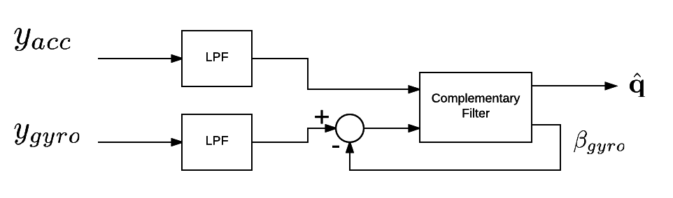 In addition to the complementary filter, accelerometer and gyro measurements are filtered using a simple low-pass filter (LPF) to cut out noise from vibrations. A block diagram of the estimator is shown below for reference. y_{gyro} and y_{acc} are gyro and accelerometer measurements, respectively and \beta_{gyro} is the estimated gyro biases.