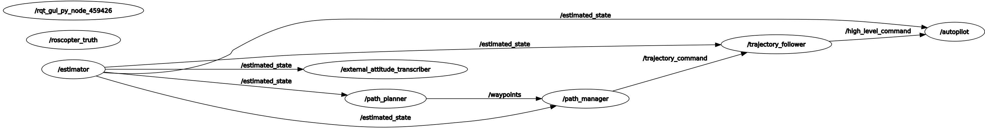 /command: Commands sent to ROSflight firmware (see rosflight_msgs/msg/Command for details)/estimated_state: Complete vehicle state from EKF (position, velocity, attitude, angular rates)/external_attitude: External attitude reference sent to firmware estimator to prevent drift/high_level_command: High-level control commands fromtrajectory_followertoautopilot/sim/roscopter/state: ROScopter-formatted state message from simulation truth/trajectory_command: Trajectory commands from path manager to trajectory follower/waypoints: Current waypoint list and mission information