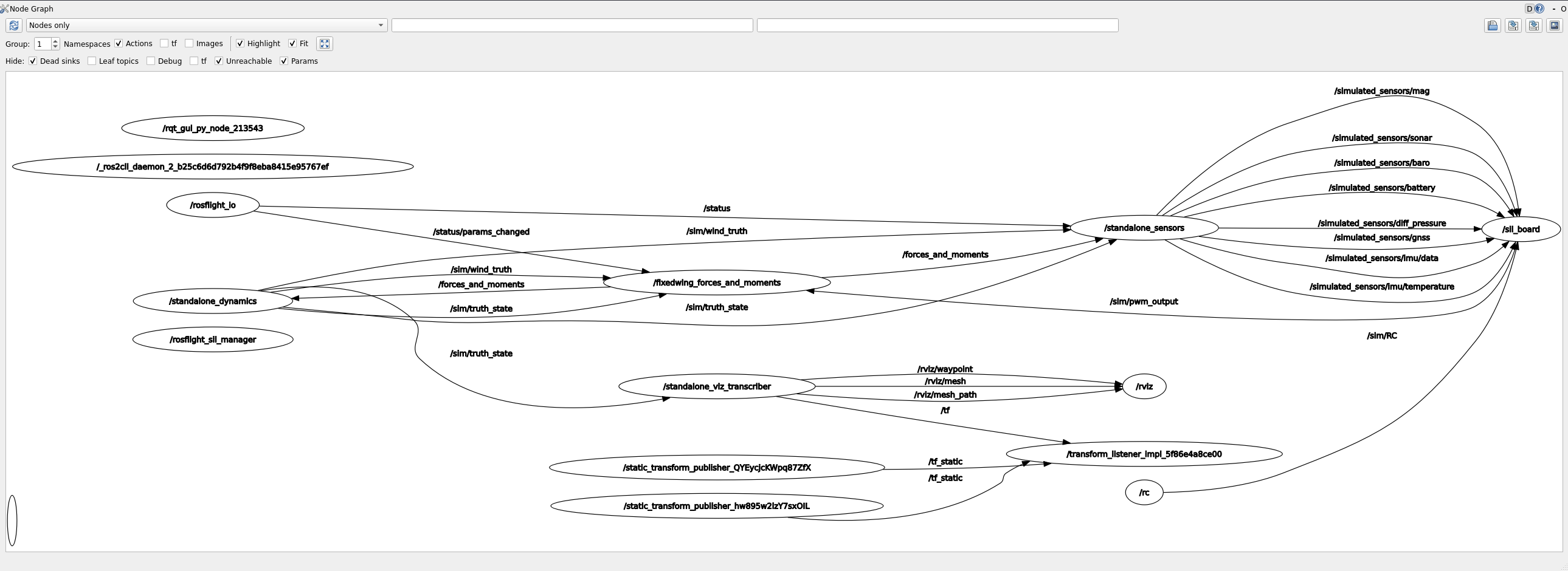 The ROSflight simulator is organized as a collection of ROS2 nodes that each provide different functionality. As we work through launching the sim, we'll look at some of those modules and discuss what they do.