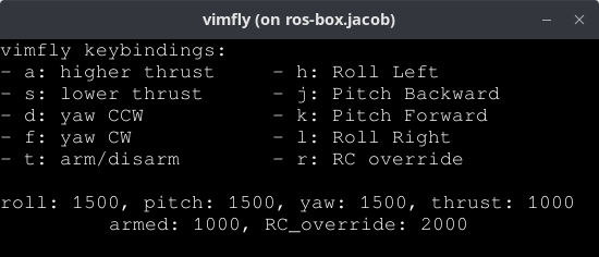 use_vimfly:=trueparameter:# Multirotor with keyboard control cd ~/rosflight_ws ros2 launch rosflight_sim multirotor_standalone.launch.py use_vimfly:=true # Fixed-wing with keyboard control cd ~/rosflight_ws ros2 launch rosflight_sim fixedwing_standalone.launch.py use_vimfly:=trueYou'll notice that we