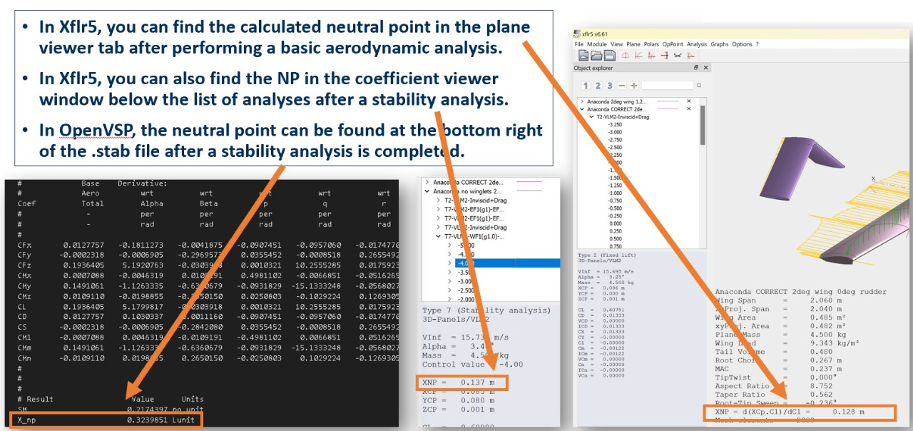 In Xflr5, you can find the calculated neutral point in the plane viewer tab after performing a basic aerodynamic analysis. You can also find the NP in the coefficient viewer window below the list of analyses after a stability analysis.