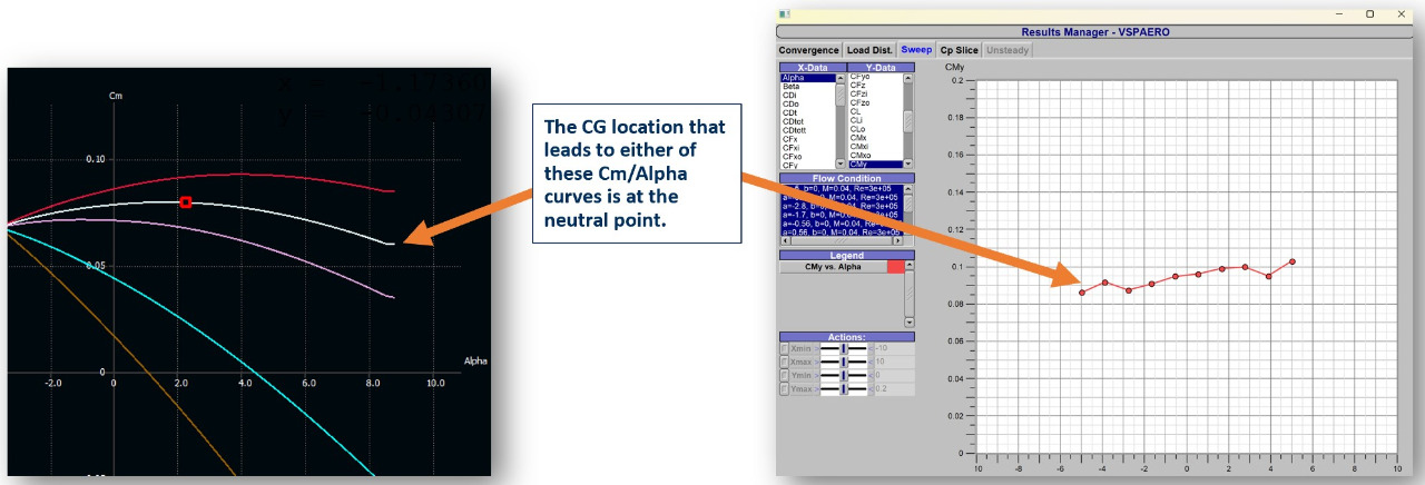 The neutral point can also be found in both Xflr5 and OpenVSP by finding the CG location at which the Cm vs. Alpha curve has a flat slope.