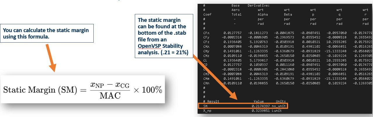 Static margin is a measure of how stable an aircraft is. A higher SM means the aircraft will more quickly stabilize itself from disturbances, which usually also results in a lower maneuverability.