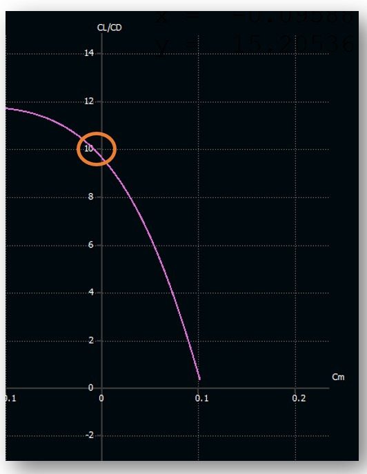 The CL/CD vs. Cm chart y-intercept shows the glide ratio.