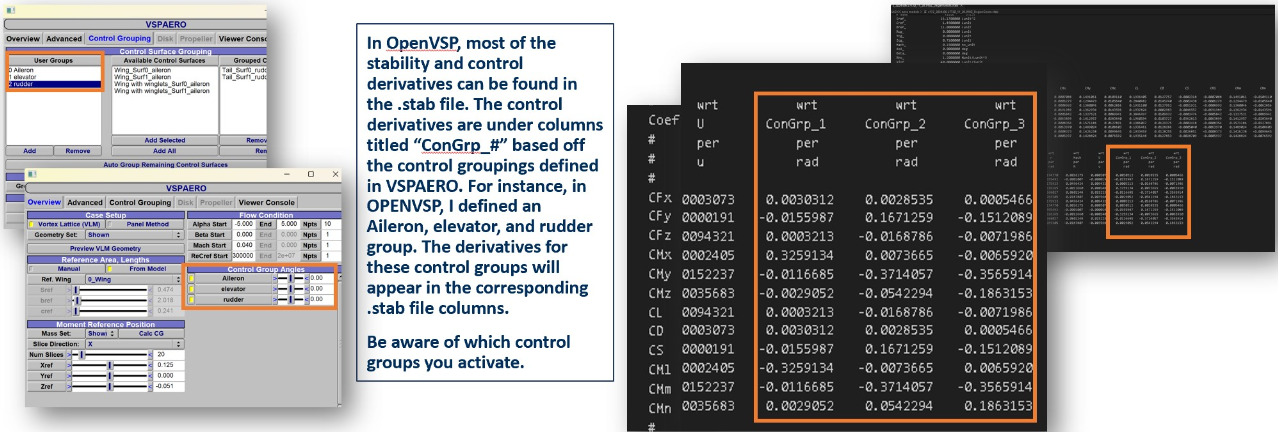 Example: have one stability analysis with ailerons activated to get the aileron control derivatives, and another analysis to get the elevator control derivatives.