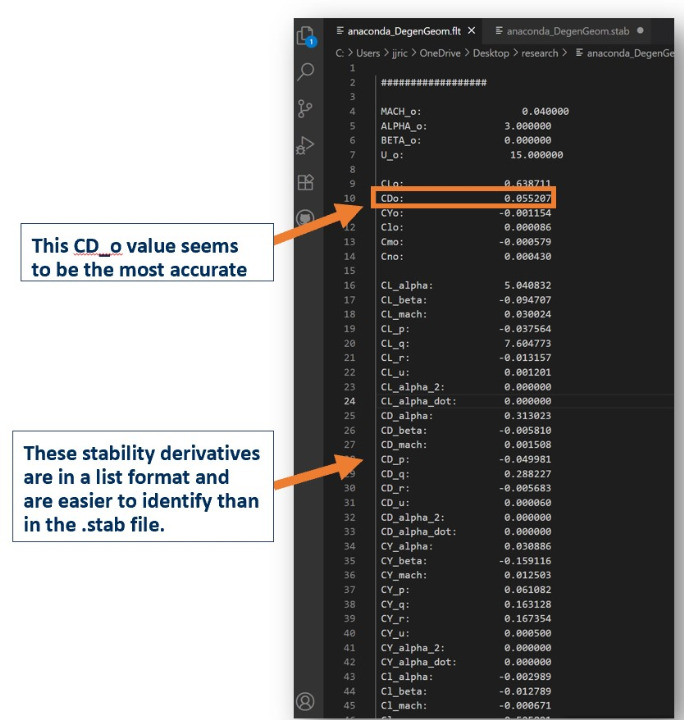 The .flt file contains all of the stability derivatives, but does not contain the control derivatives. The drag coefficients in here seem to be the most accurate.