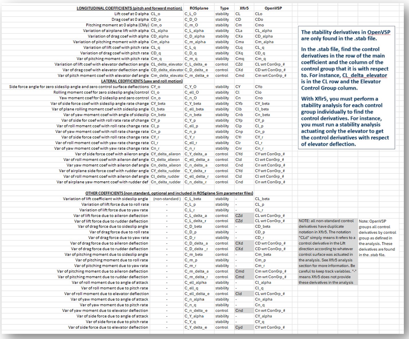 It also lists and compares the stability and control derivative naming conventions for each tool discussed in this manual (ROSplane, Xflr5, and OpenVSP).