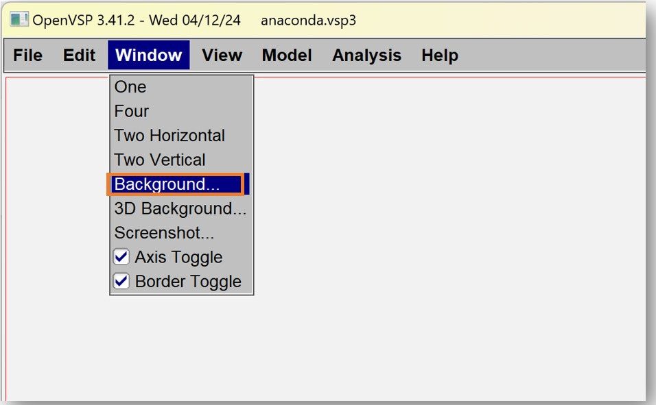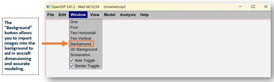 The "Window" tab allows you to customize the viewing windows. The "Background" tool is especially useful when creating aircraft models. Import a picture or drawing of an aircraft to help with dimensioning or relative positioning. The "Background" button allows you to import images into the background to aid in aircraft dimensioning and accurate modeling.