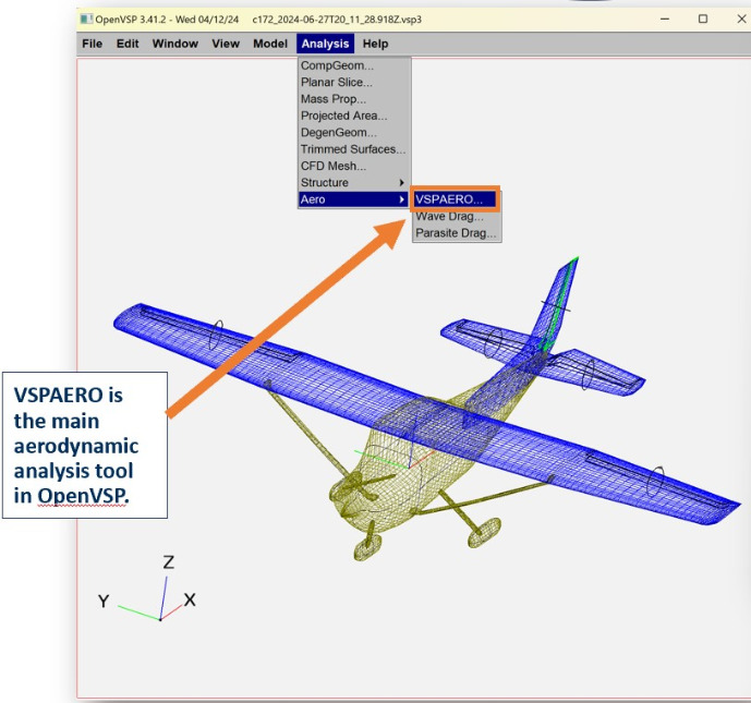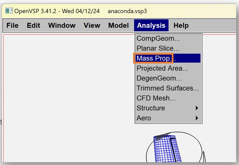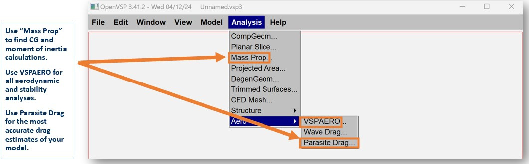 In the "Analysis" tab you can find several helpful analysis tools for performing mass properties, drag, aerodynamic, and stability analyses. Use "Mass Prop" to find CG and moment of inertia calculations. Use VSPAERO for all aerodynamic and stability analyses. Use Parasite Drag for the most accurate drag estimates of your model.