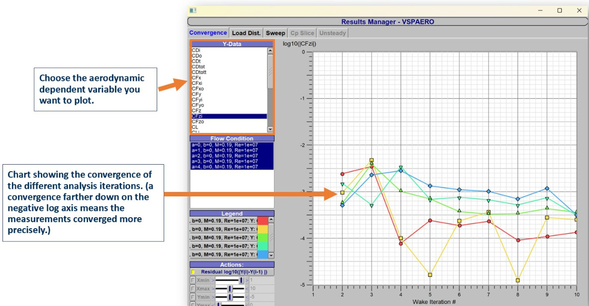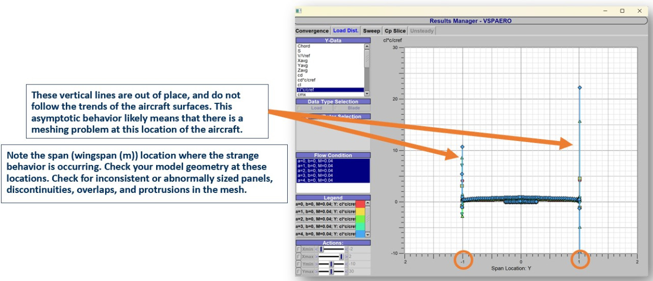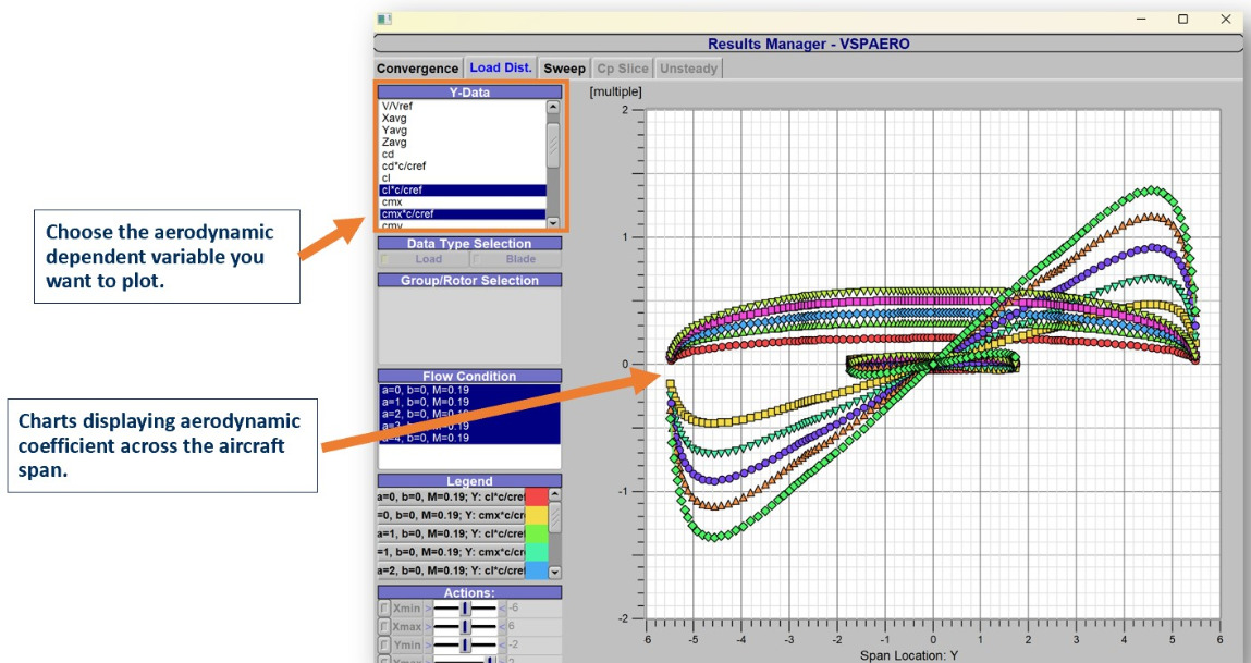 When the analysis is finished, a results manager tab will open. On the "Load Dist." tab, you can see charts portraying a variety of aerodynamic coefficients across the span of the wing.