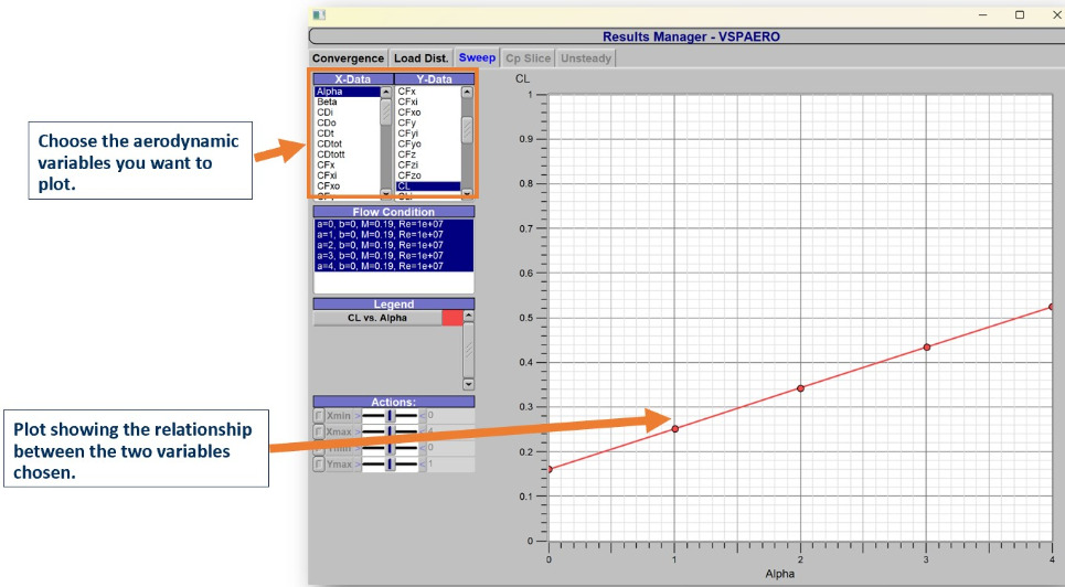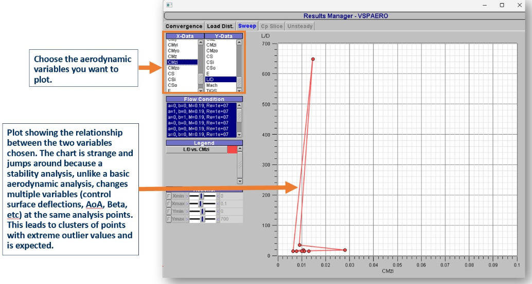 The "Sweep" tab allows you to compare relationships between aerodynamic coefficients.