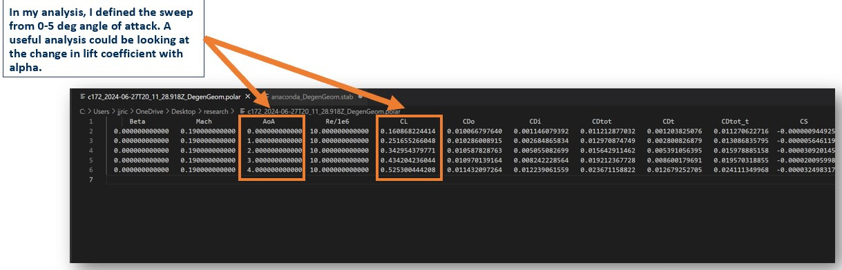 In my analysis, I defined the sweep from 0-5 deg angle of attack. A useful analysis could be looking at the change in lift coefficient with alpha.