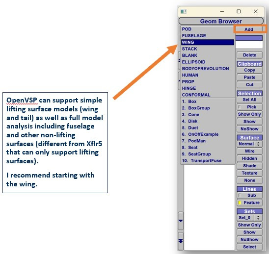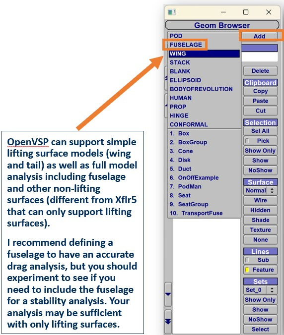 Select the geometry creation tool by clicking the drop-down menu at the top of the window. After selecting the "fuselage" geometry item, click "add".