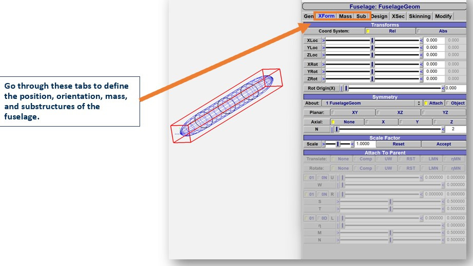 Go through these tabs to define the position, orientation, mass, and substructures of the fuselage.