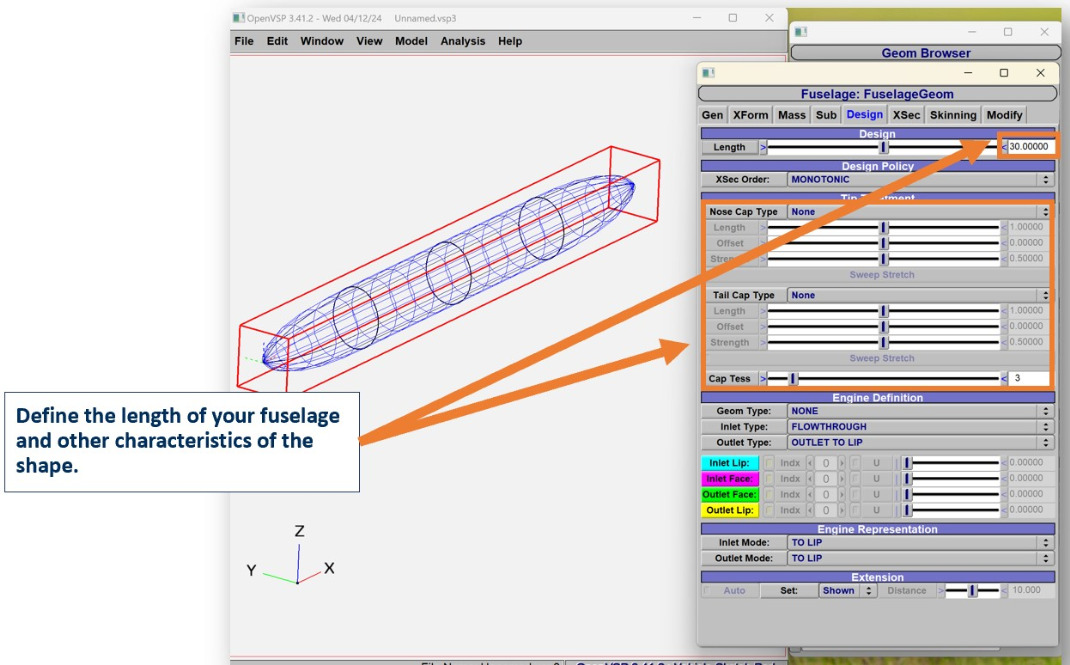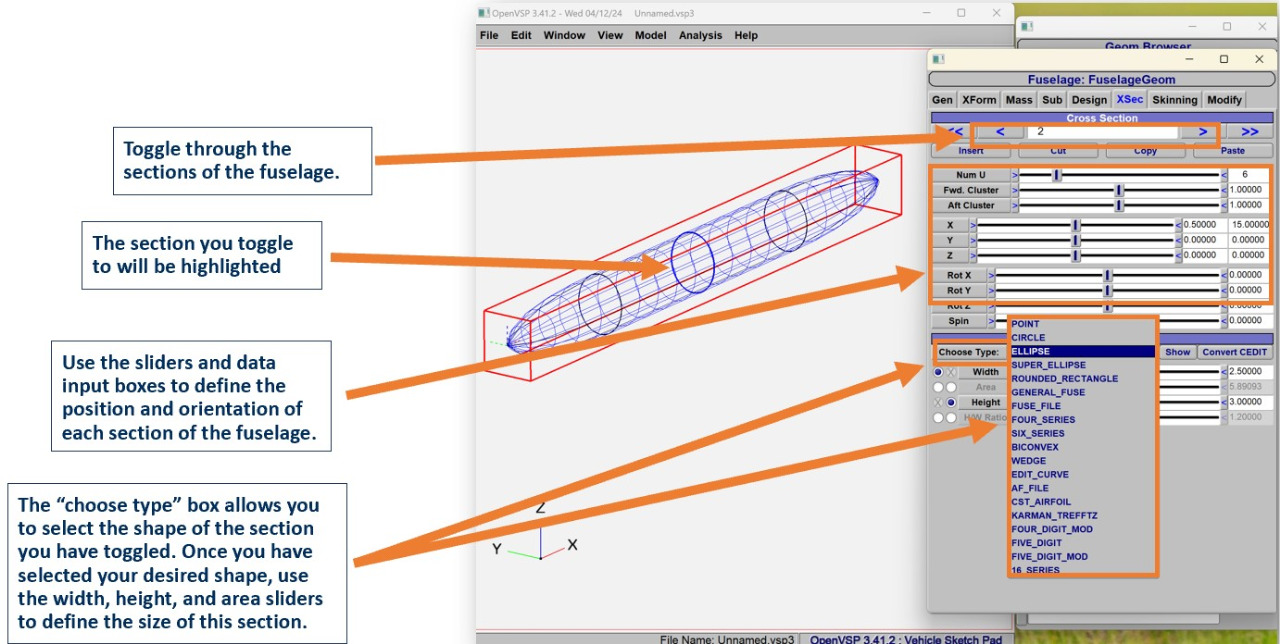 In the "Xsec" tab, you can customize the position, orientation, and shape of each section of the fuselage.