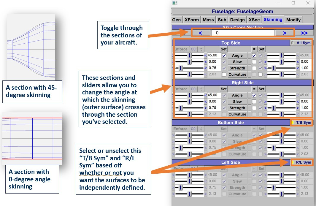In the "Skinning" tab, you can adjust the shape and curves of the outer surfaces on the fuselage.