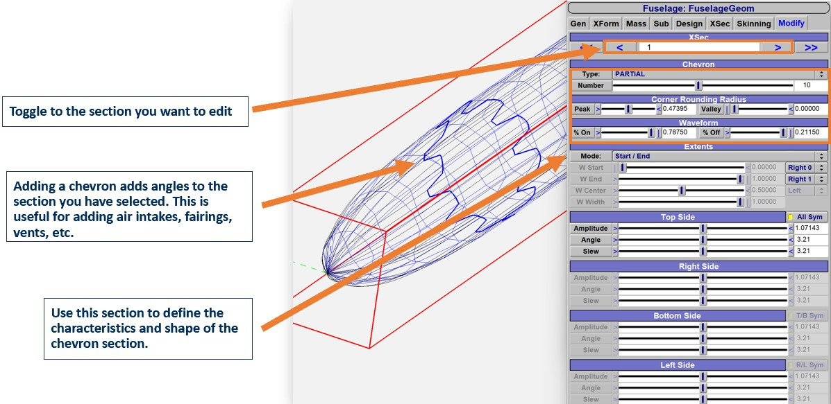 The "Modify" tab allows you to further edit the sections of the fuselage by adding "chevron" shapes (used to define more complex shape contours).