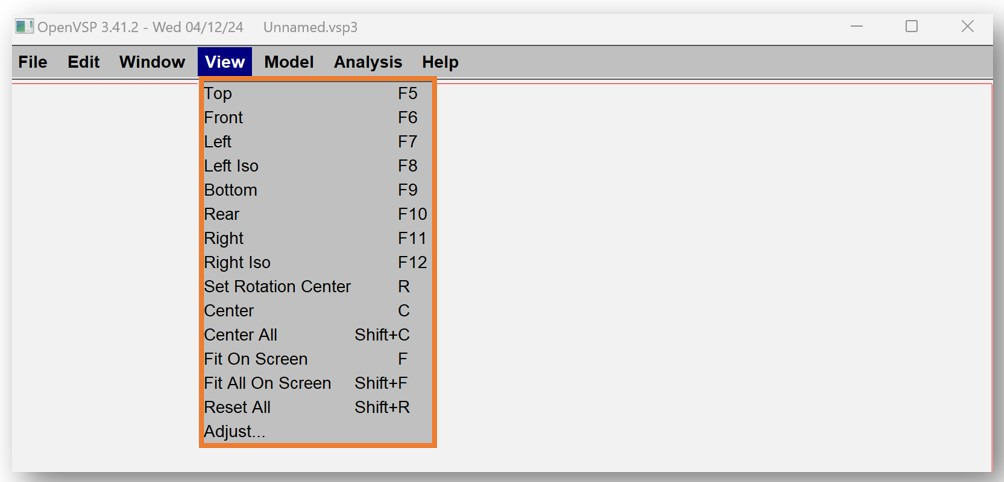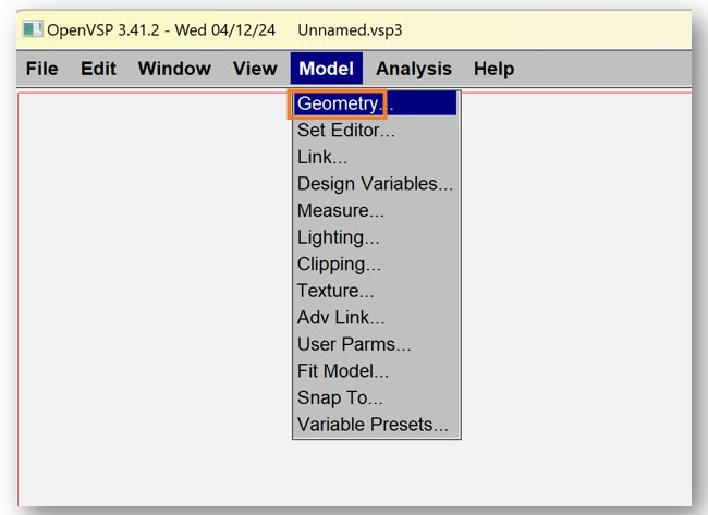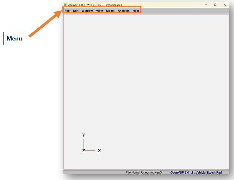 When OpenVSP first opens on your computer, you will see an empty screen with a menu up top. The following slides will go through important menu options.