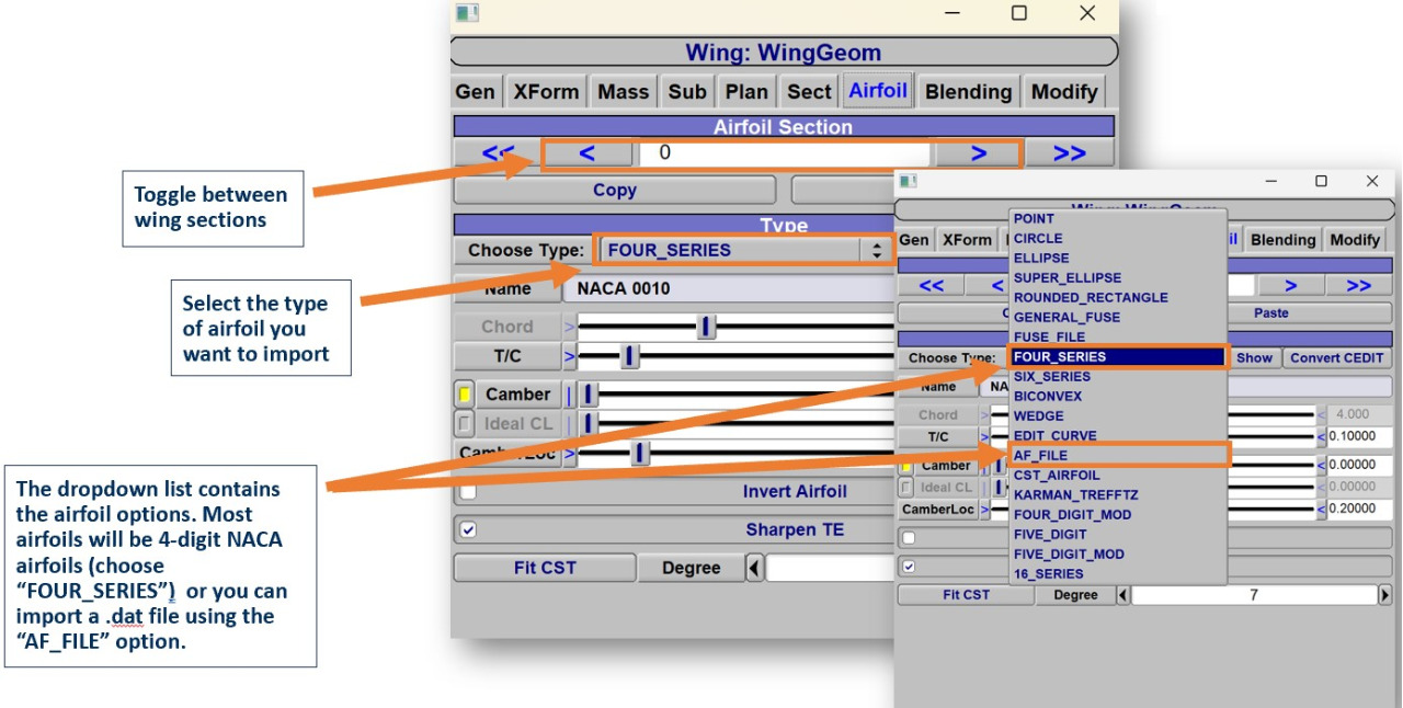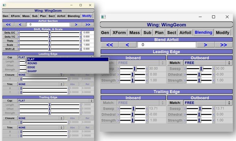 The Blending and Modify tabs have tools to blend airfoils together and edit the edge characteristics. These are more technical options that are outside of the scope of this manual.