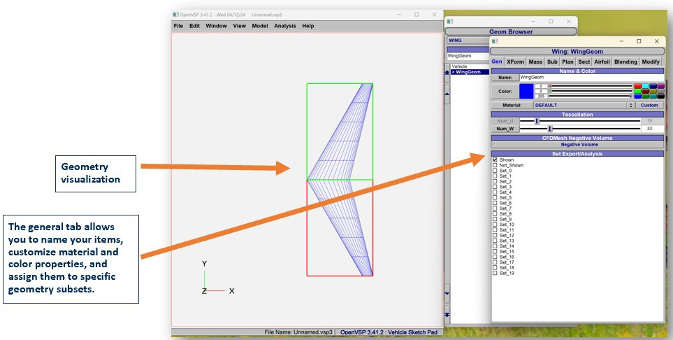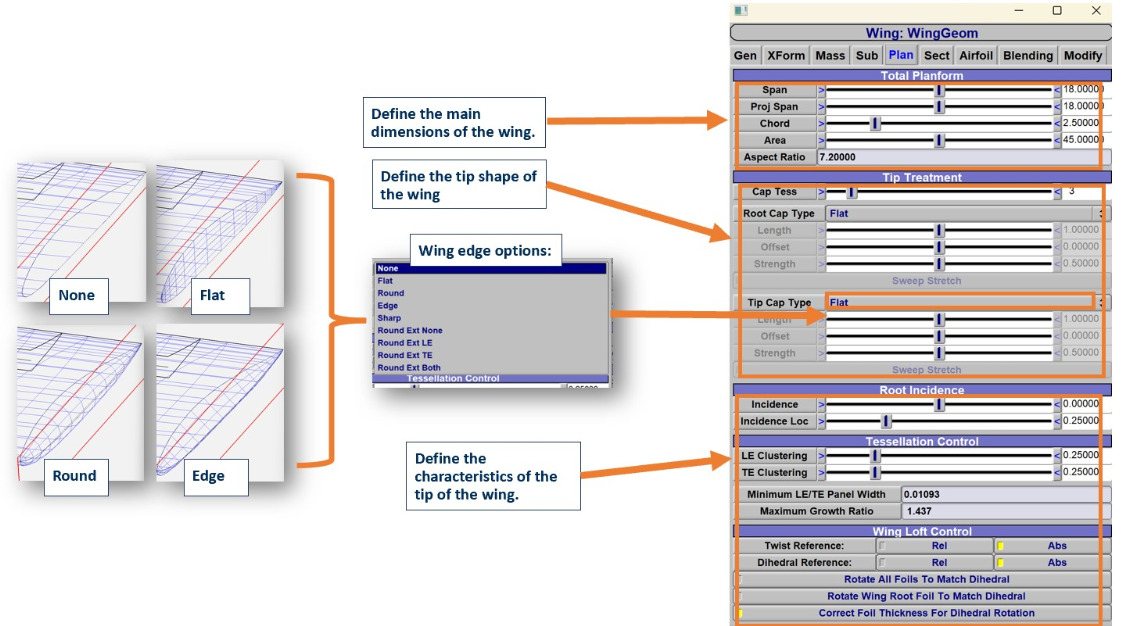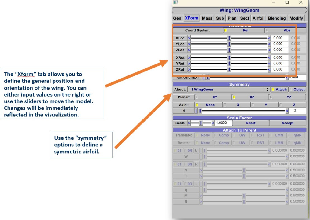 Use the Xform tab to define the position, orientation, and other general characteristics of the wing.