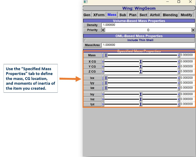 The "Xform", "Mass", and "Sub" tabs are very similar to those for wings. Use these tabs to define the position, orientation, mass, and substructures of the fuselage.