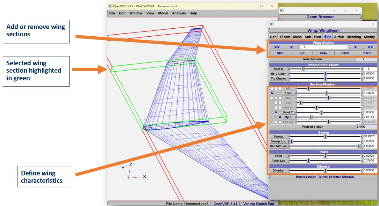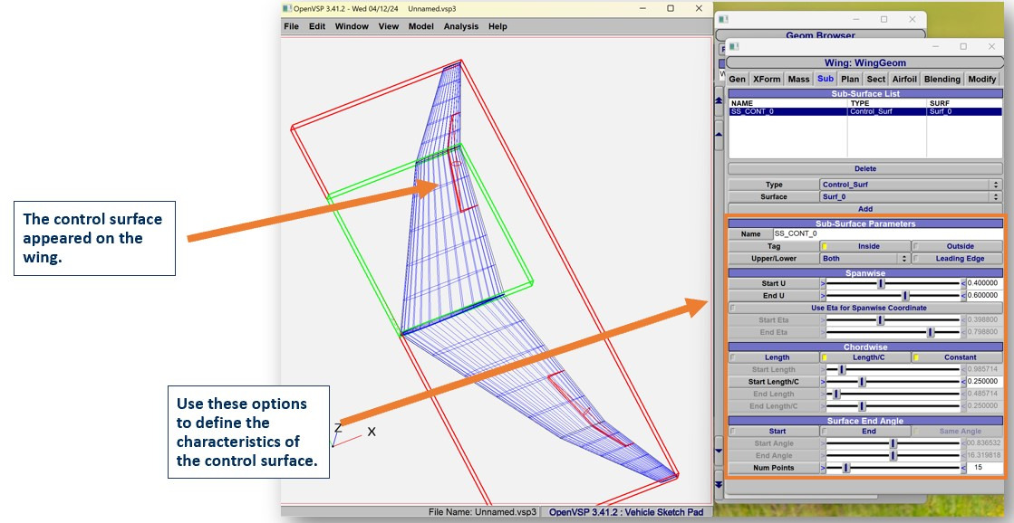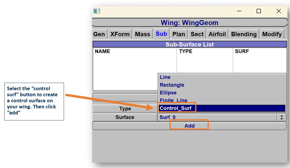 In the "Sub" tab, define subsections of the wing, such as control surfaces.