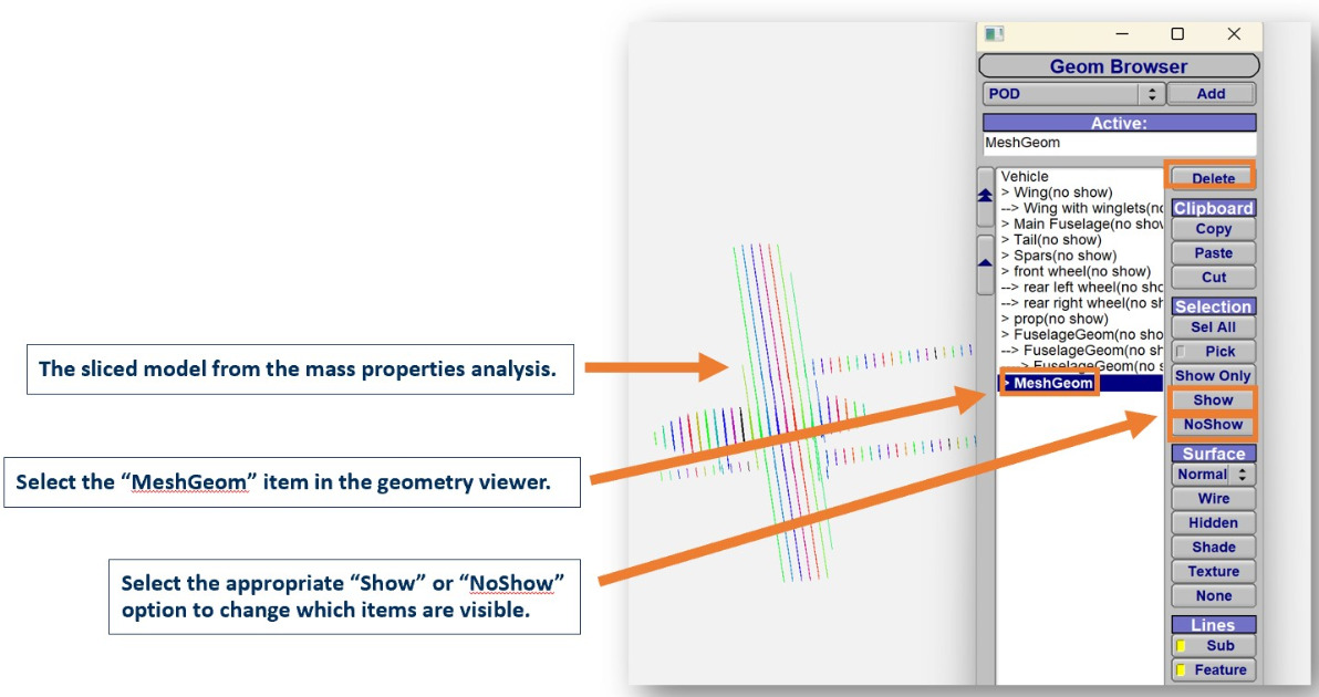 To go back to viewing the original model, select "MeshGeom" in the geometry list and then click either "NoShow" or "Delete".