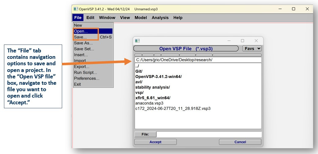 The "File" tab contains navigation options to save, export, and open projects. In the "Open VSP file" box, navigate to the file you want to open and click "Accept."