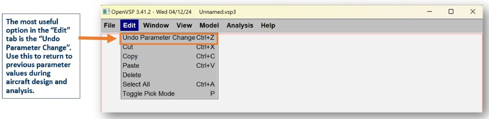 The "Edit" tab provides useful tools for setting parameter values during model creation and analysis. The most useful option in the "Edit" tab is the "Undo Parameter Change". Use this to return to previous parameter values during aircraft design and analysis.