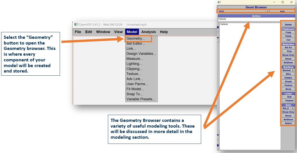 In the "Model" tab, select the "Geometry" tool to open the model geometry browser.