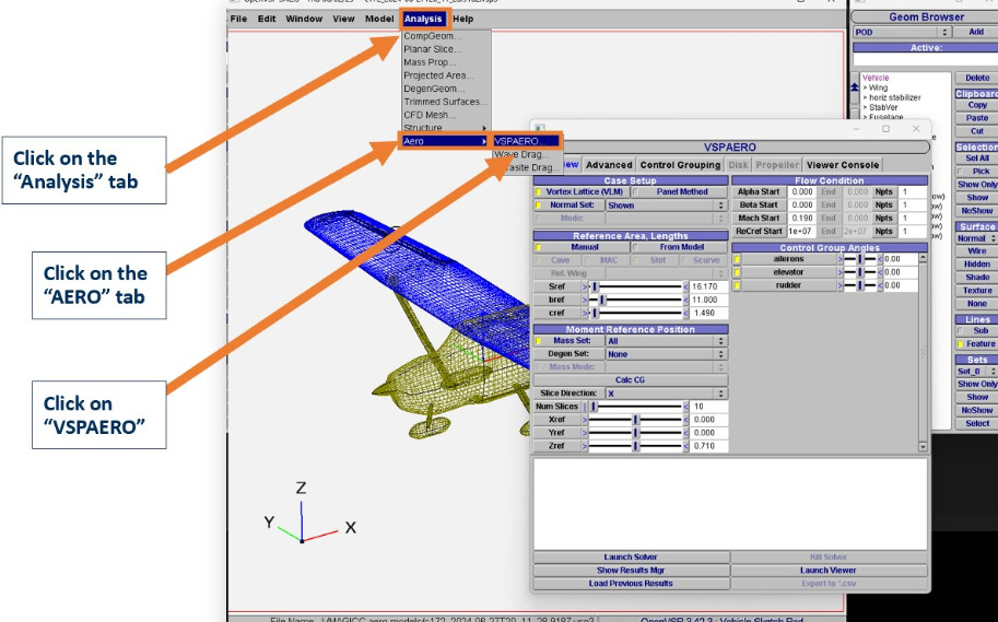 OpenVSP is a free, open-source aerodynamic modeling and analysis software tool based upon NASA aerodynamics tools. This tool is especially useful for modeling and analyzing full aircraft (including fuselage, propellers, landing gear, etc). These capabilites provide better drag estimates than many other tools such as Xflr5. OpenVSP also allows you to import background images to help with modeling your aircraft dimensions accurately and outputs a comprehensive stability coefficients file that are very helpful when analyzing aircraft. Besides these specific distinguishing factors, much of the functionality is similar to what is found in other software tools. There are many advanced modeling and analysis capabilities as well, such as structural analysis and wave drag estimates from supersonic flows. These will not be covered in this manual, but links to a series of useful resources at the end of this page may be helpful.