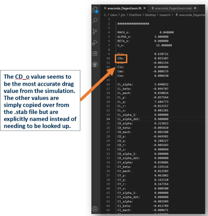 The .flt file contains the stability derivatives arranged in a more explicitly defined list. The values are the same as the .stab file; however, the CD_o value is different. This seems to be the more accurate drag value, and may include other sources of drag not accounted for in the .stab file.