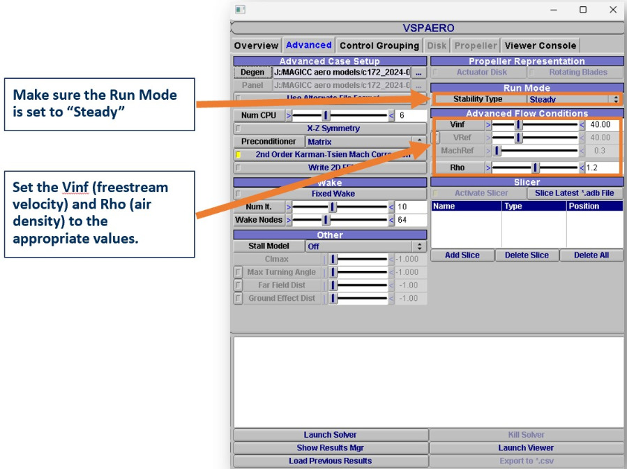 In the Advanced tab, make sure the run mode is set to "Steady" and the advanced flow conditions are appropriate for your flight situation. (default units are in SI)