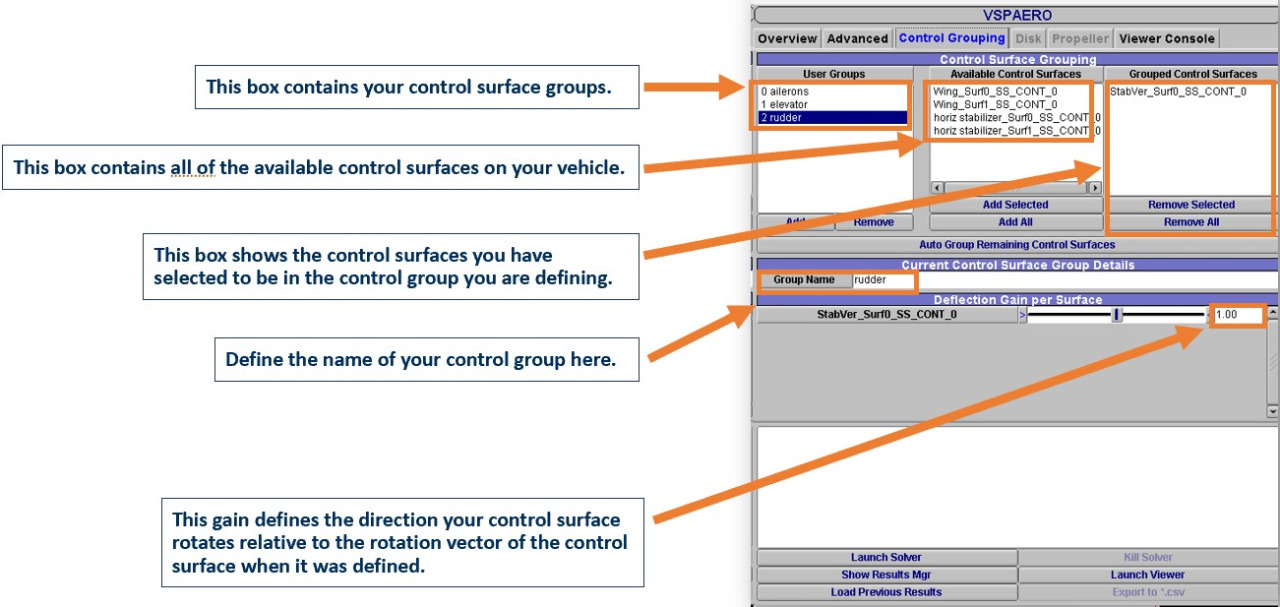 In the "Control Grouping" tab, select specific control surfaces to assign to control groups for the analysis.