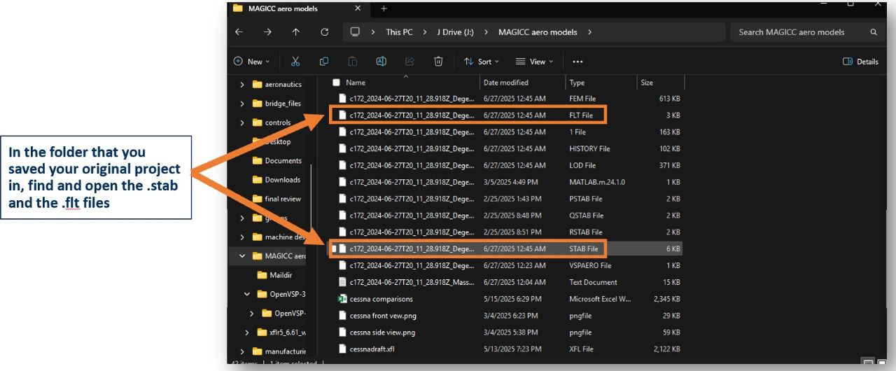 After an analysis is completed, OpenVSP will produce several files containing the analysis outputs. These files will appear in the same folder that you saved your original project in. The most useful files produced from the stability analysis are the (.stab) file and the (.flt) file.