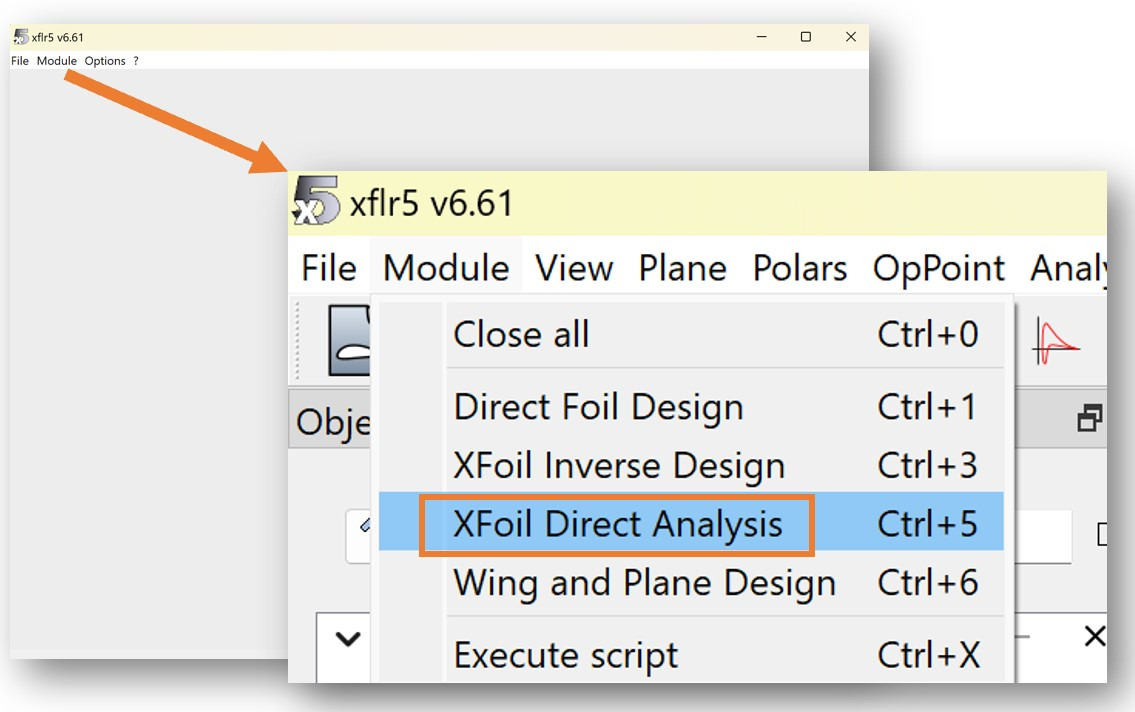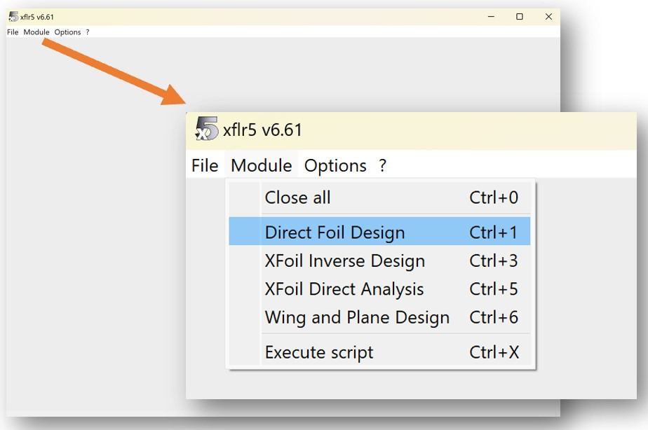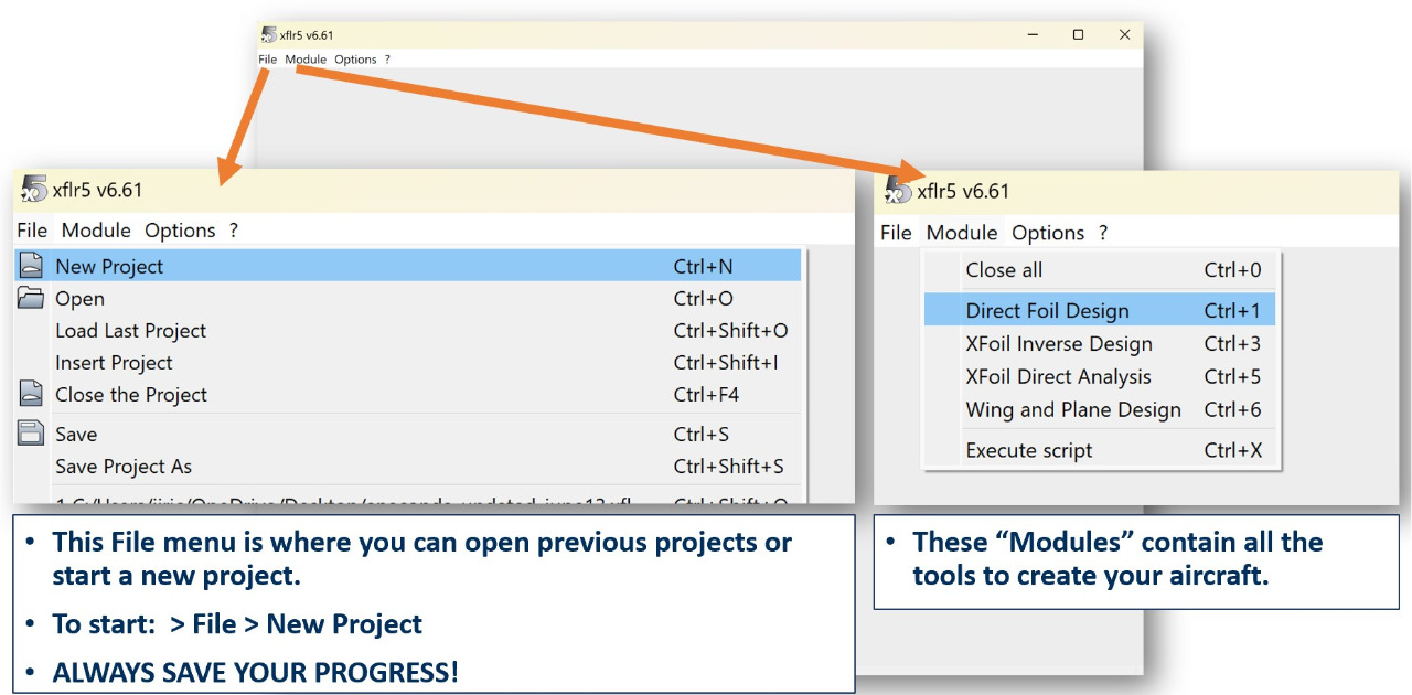Under the File tab you can open and save projects. In the Module tab you can access the different modules of XFLR5.
