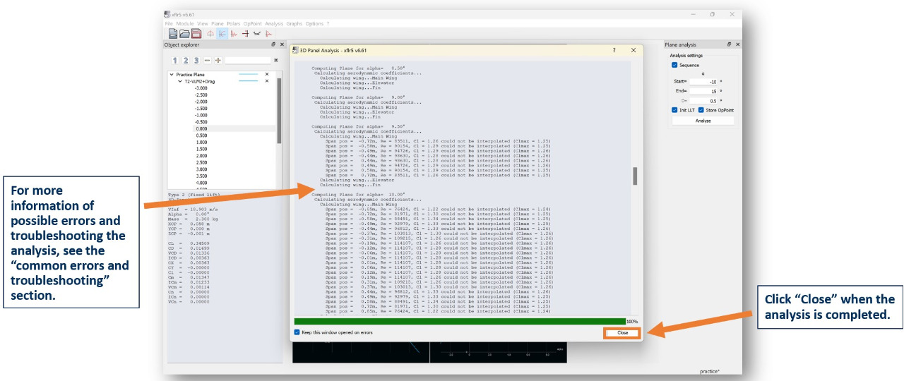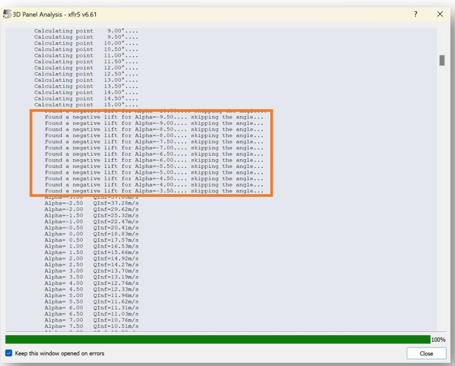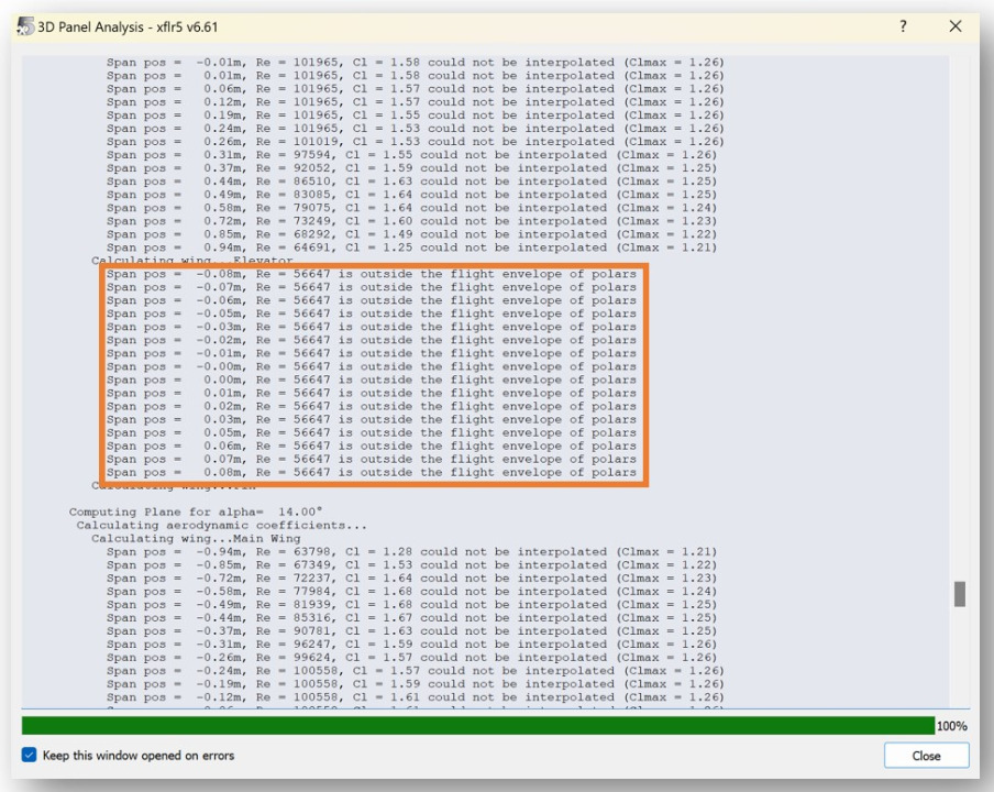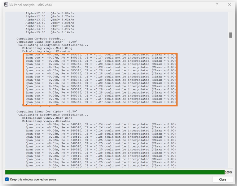 Cause: XFLR5 failed to interpolate a value because a requested parameter (e.g., lift coefficient or moment) is between or outside available data points.