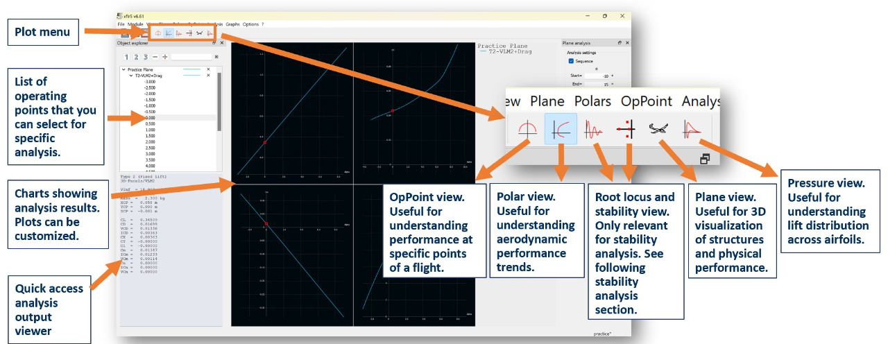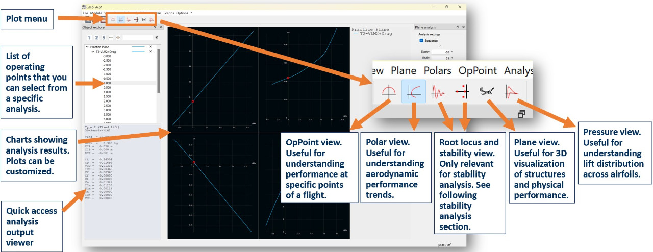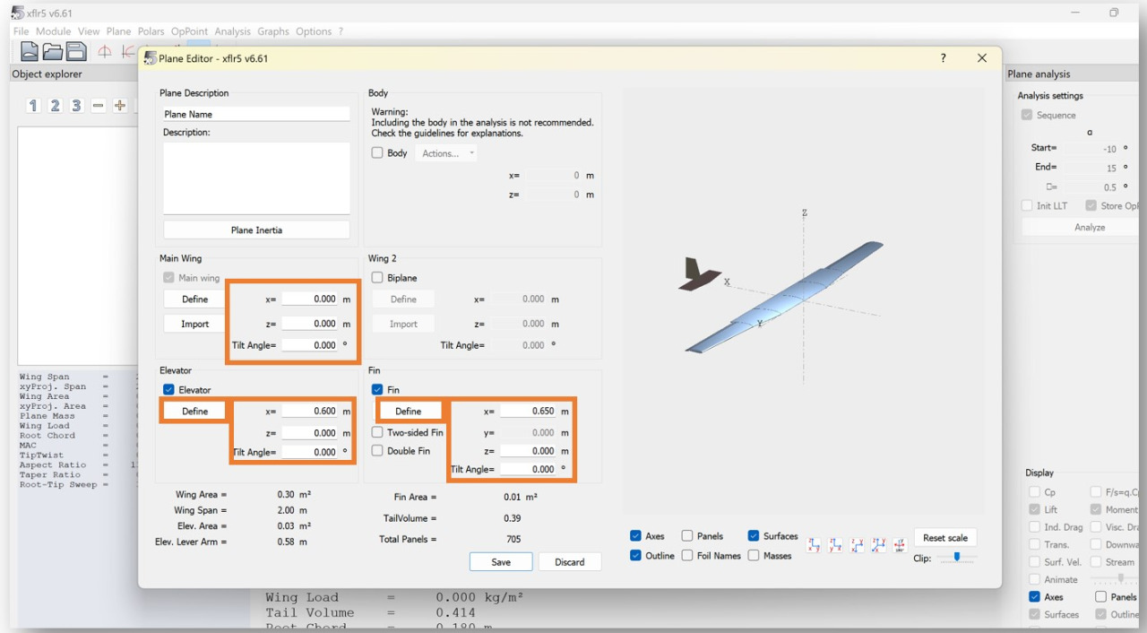 Wing and Plane Design is where you can use your previously analyzed airfoils to model and analyze the performance/stability of a complete aircraft.