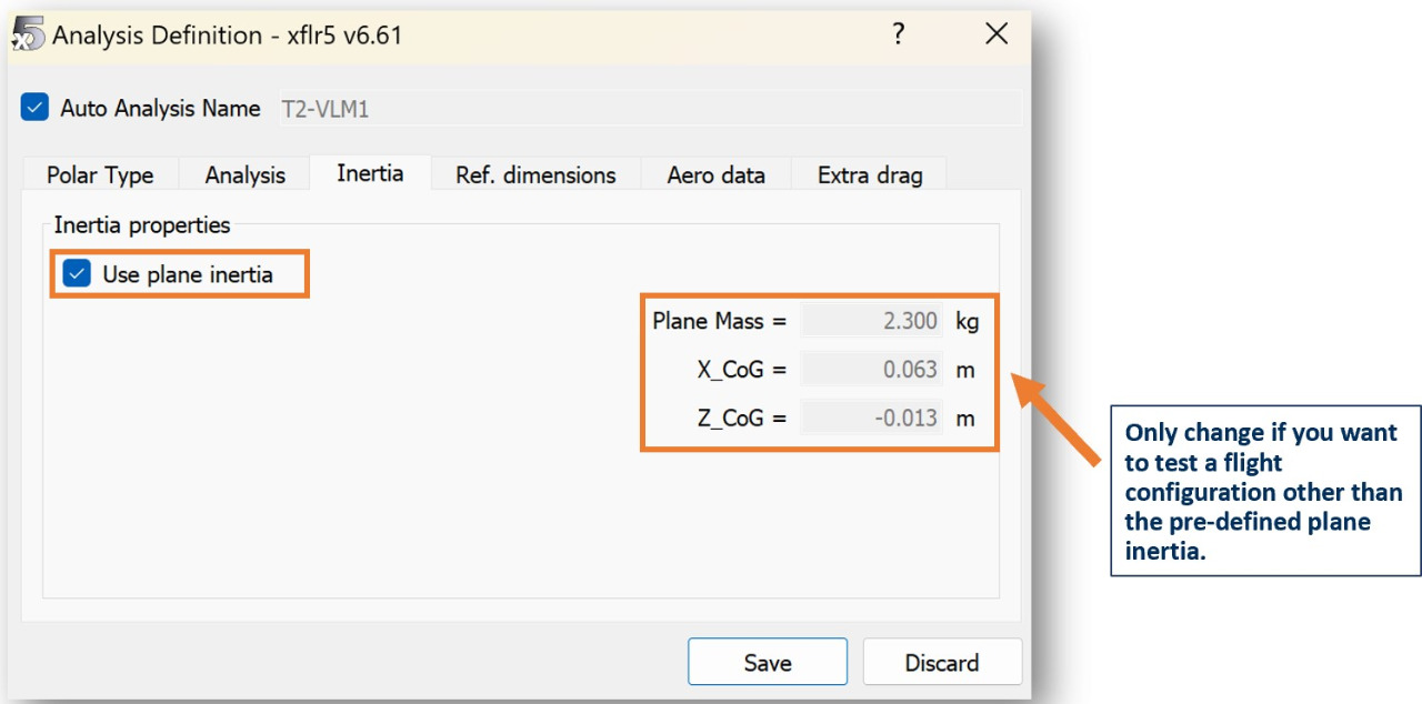 In the Inertia tab, check the "Use plane inertia" box and change nothing (assuming you already accurately defined your plane inertia). Otherwise, uncheck the box and define your Mass and CG location manually.