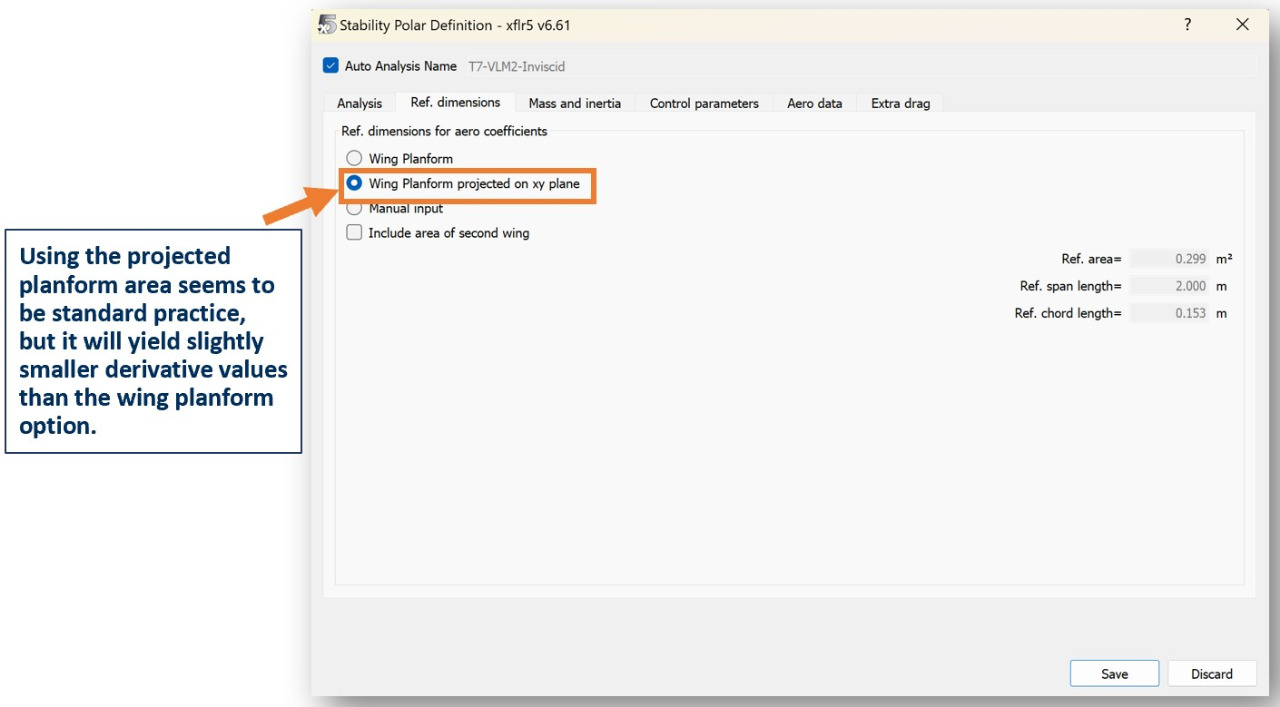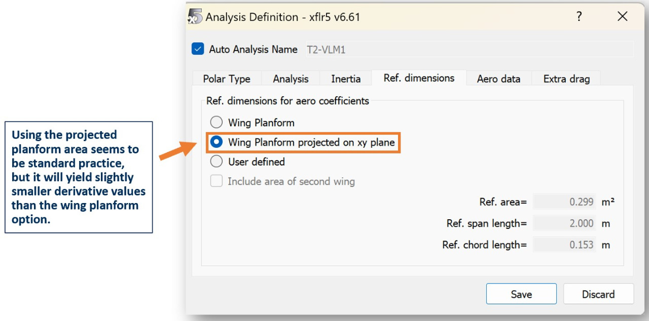 In the Ref. dimensions tab, select the dimensions you want to use for the stability and control coefficient calculations.